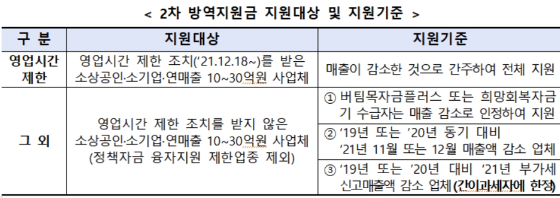 2차 방역지원금 지원 대상은 1차 대상인 320만명을 포함해 연매출 10억원 초과 30억원 이하 사업체 등이 추가돼 총 332만명에 달합니다. 이와 별도로 지난해 4분기 손실보상금 지급도 다음달 3일부터 시작됩니다