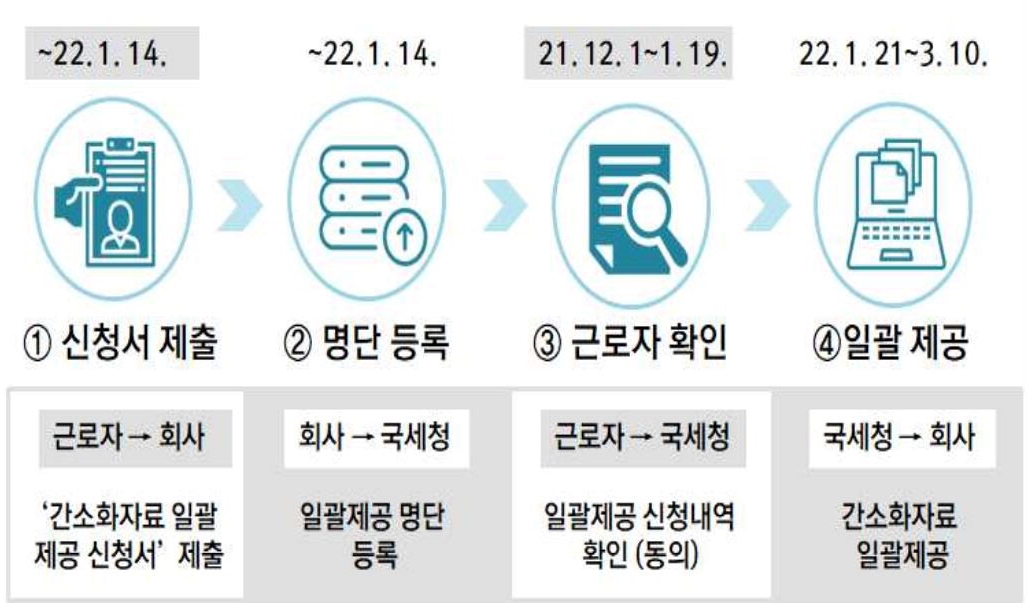 서비스 이용을 희망하는 회사는 근로자로부터 간소화자료 일괄제공 신청서를 제출받아, 신청 근로자 명단을 22년 1월 14일까지 홈택스를 통해 등록해야 합니다. 근로자는 1월 19일까지 일괄제공 신청 내용에 대한 확인(동의) 절차를 진행하고, 국세청은 확인 절차를 진행한 근로자의 간소화자료를 회사에 일괄제공하면 됩니다.